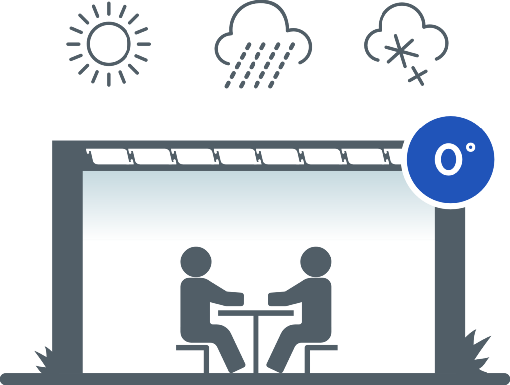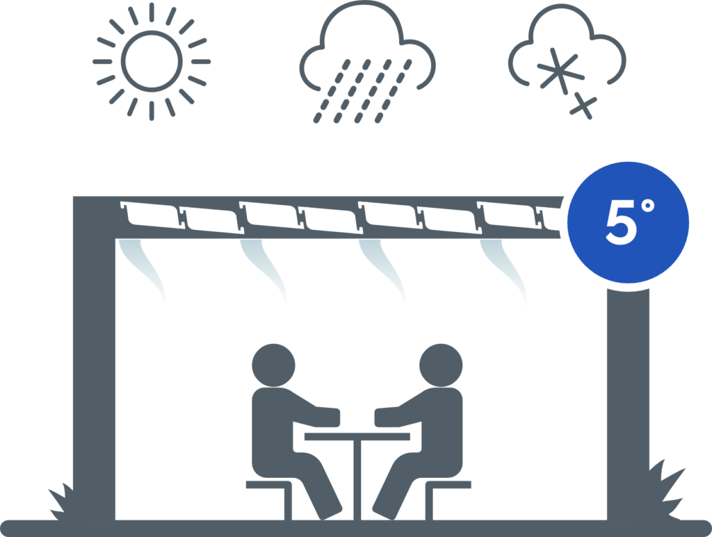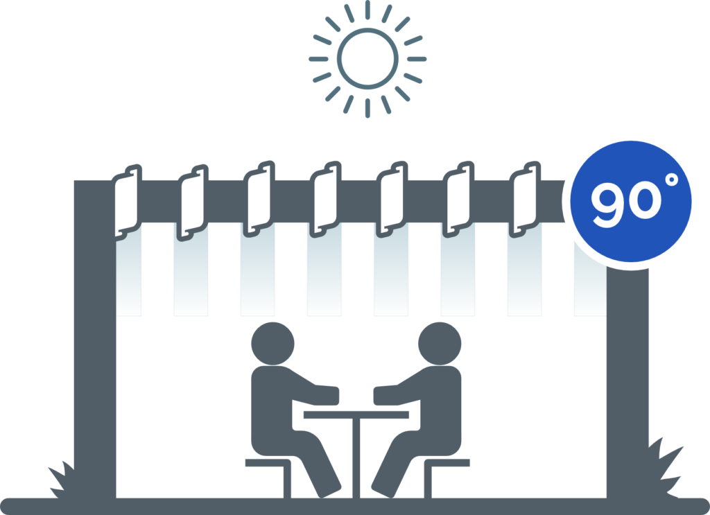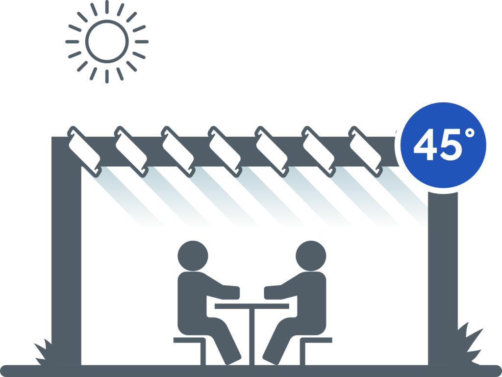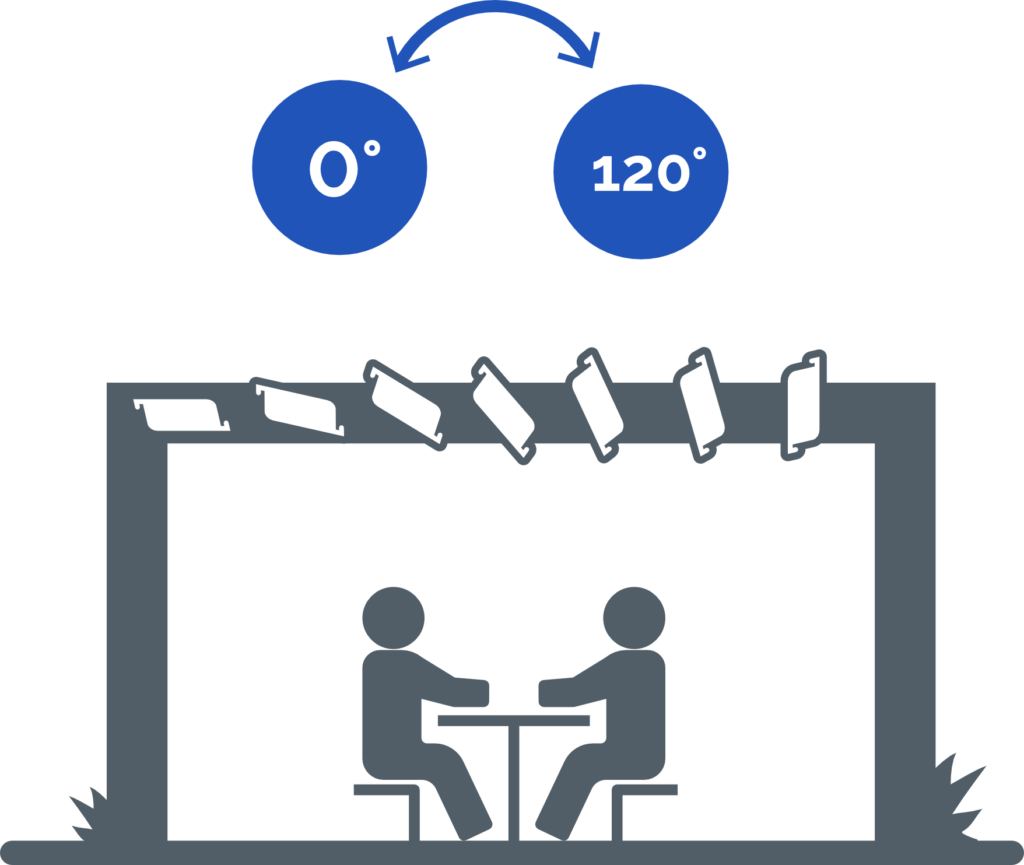 La rotación libre de las lamas de 0° a 120° permite el uso máximo de la pérgola en diferentes condiciones climáticas.
